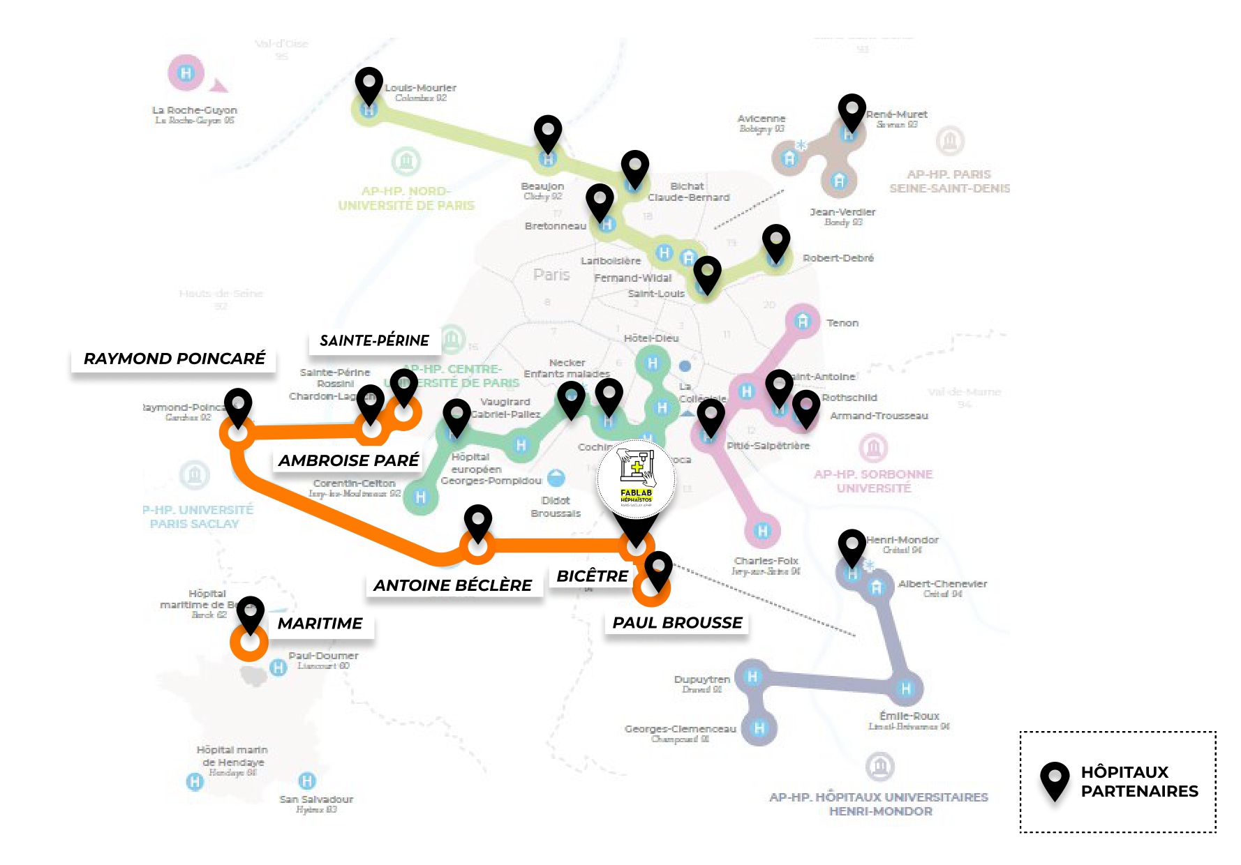 Le Fablab collabore avec un réseau de partenaires spécialistes de la conduite de projets d’innovation en santé (design centré utilisateur, IA, nouvelles technologies…)